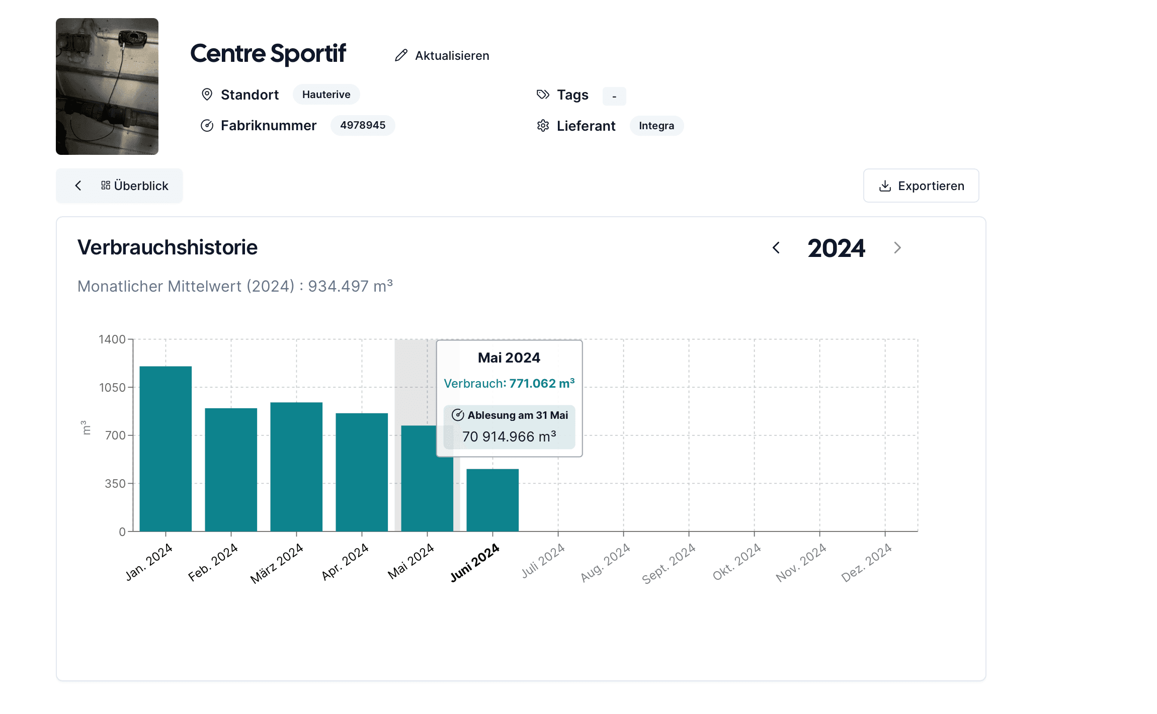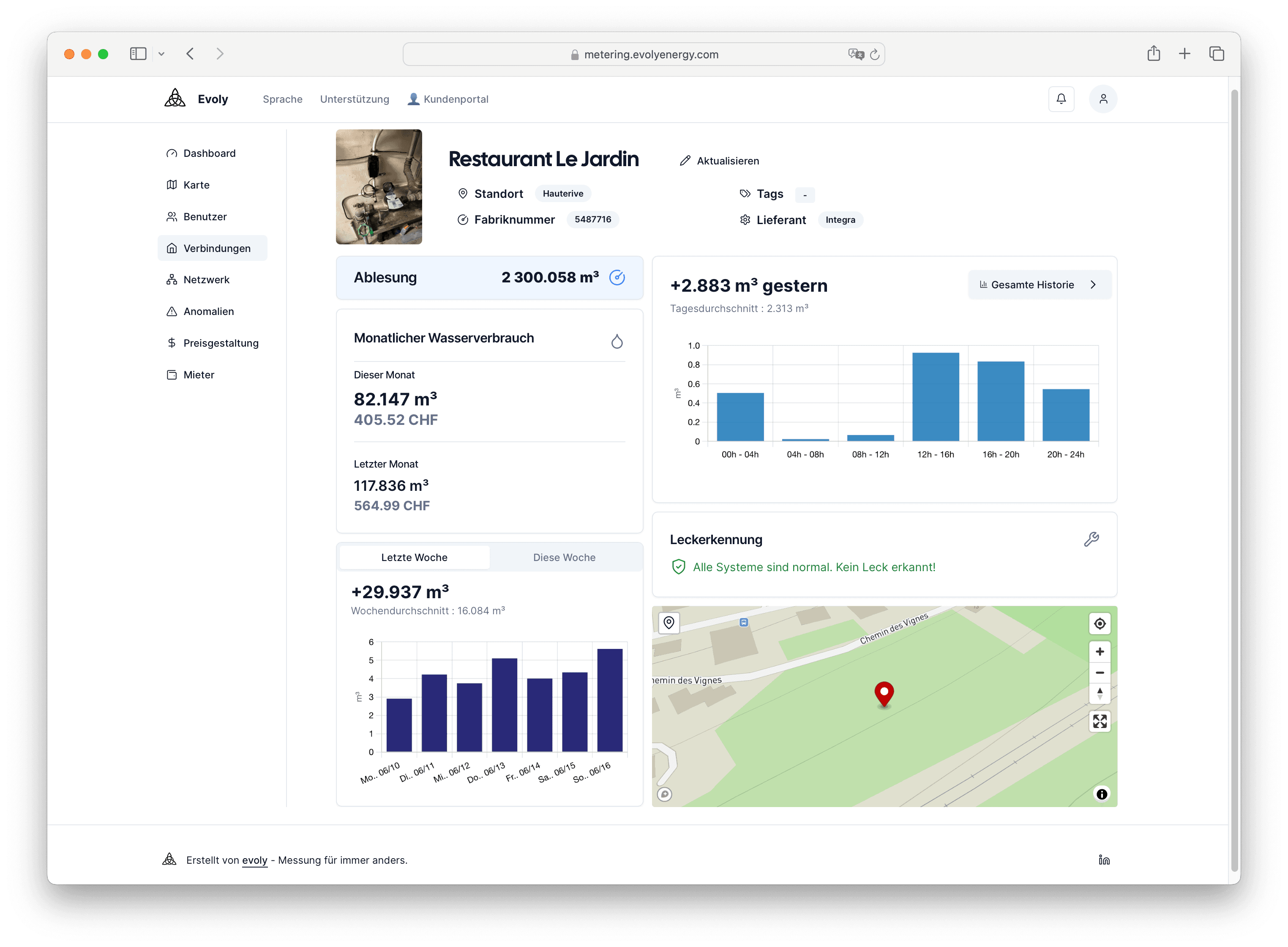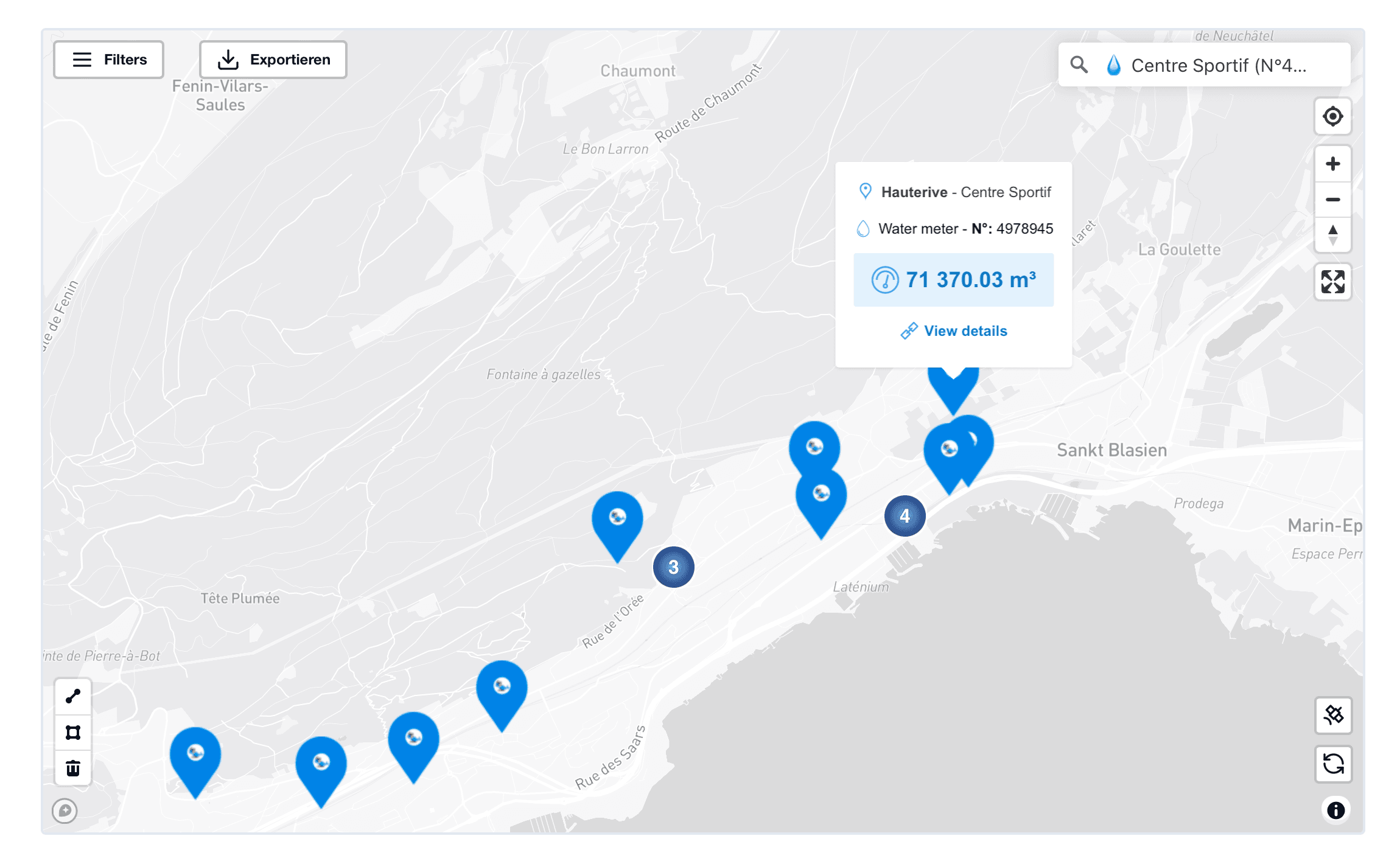 Unsere Plattform bietet eine interaktive Karte, die alle Zähler mit ihren Echtzeitlesewerten anzeigt und eine einfache Überwachung und Verwaltung Ihres Ressourcenverbrauchs ermöglicht.