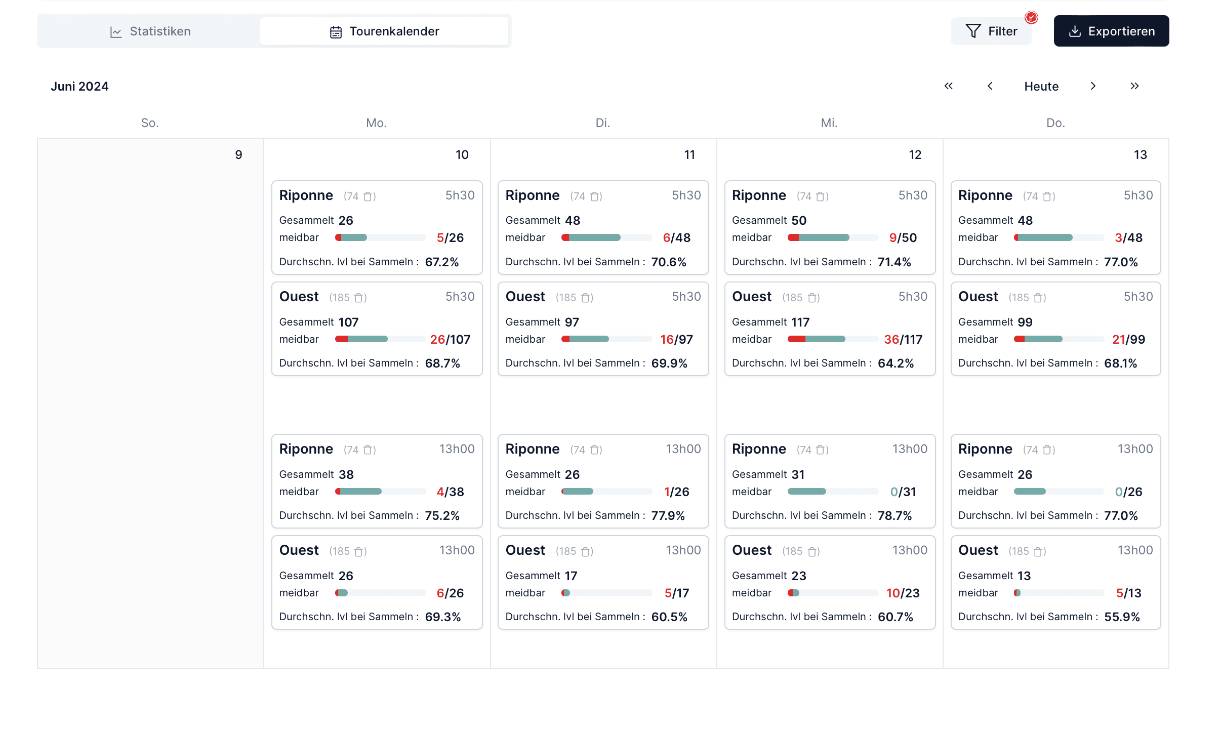 Unsere Kalenderfunktion ermöglicht es Ihnen, vergangene und aktuelle Sammelrouten zu überwachen, um sicherzustellen, dass geplante Pläne von den Teams vor Ort eingehalten werden. Diese Funktion hilft, Verantwortlichkeit zu wahren und die Planung zu optimieren.