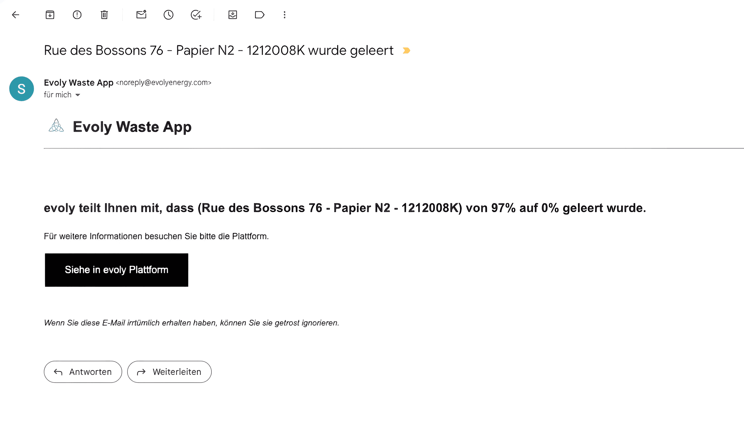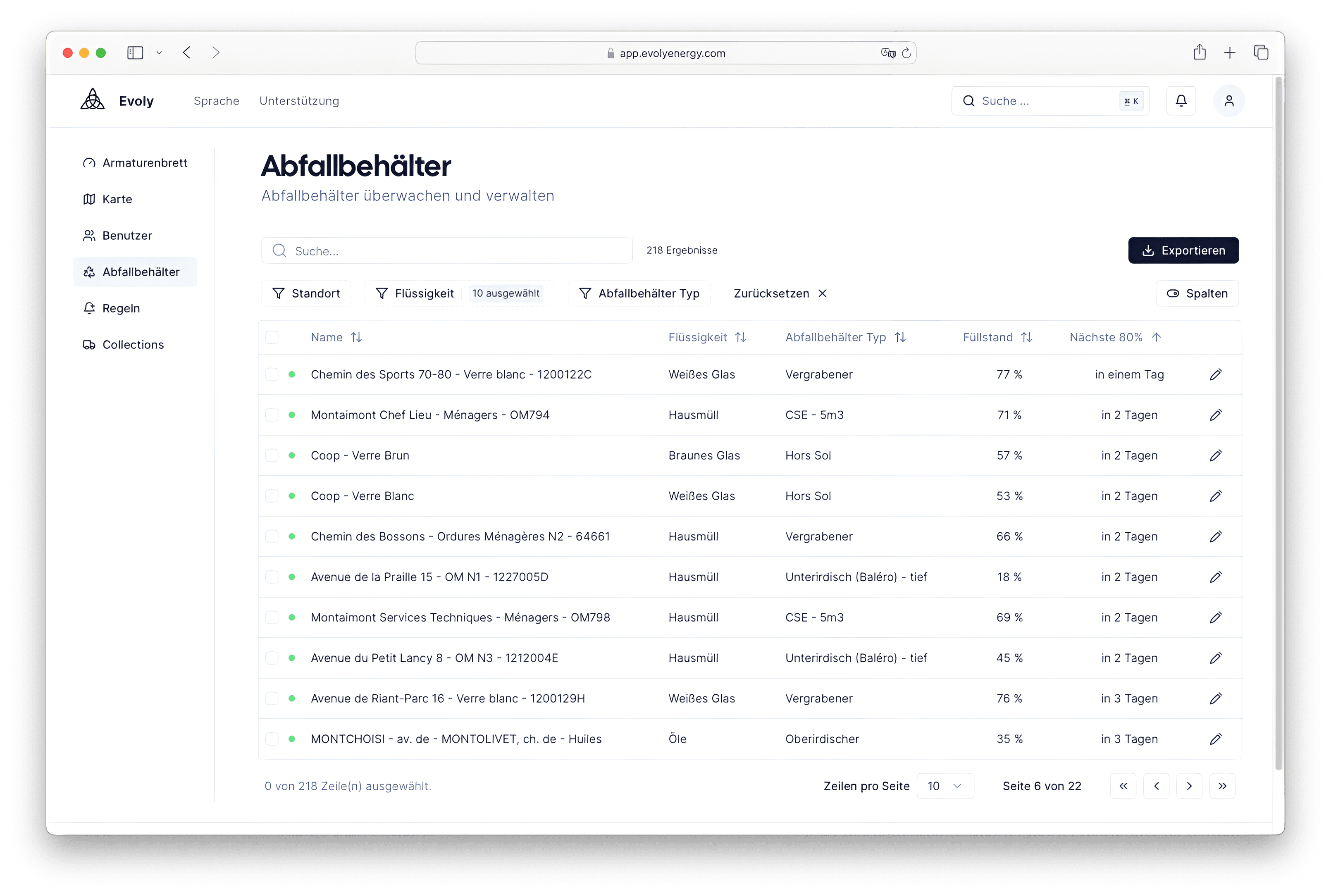 Evoly verwendet fortschrittliche Algorithmen und Echtzeitdaten, um hochgenaue Füllstandvorhersagen zu liefern, die Ihnen helfen, Sammlungen effektiver zu planen.