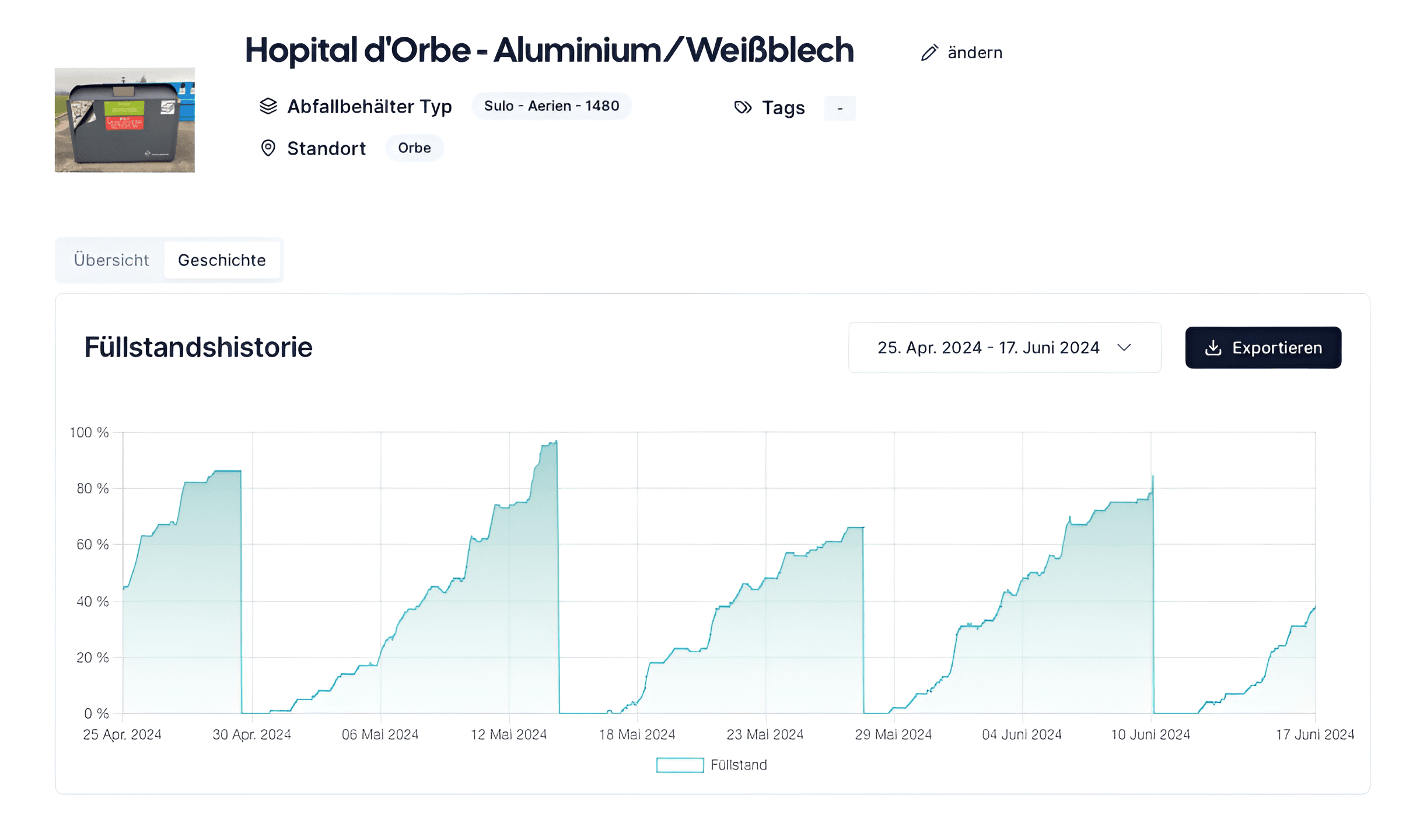 Unser Alarmsystem benachrichtigt Sie, wenn eine Mülltonne geleert wird oder ihr Füllstand einen bestimmten Schwellenwert überschreitet. Diese Funktion hilft, Verschmutzung zu verhindern und Kosten zu senken, indem Abfall nur bei Bedarf gesammelt wird.