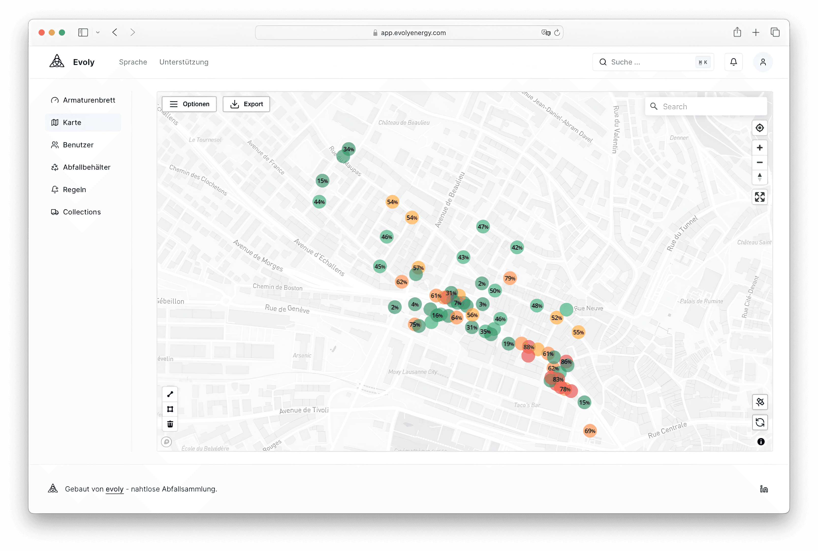 Evoly verwendet fortschrittliche Sensoren und Echtzeitdaten, um Einblicke in die Füllstände der Behälter zu geben und Sammelrouten zu optimieren, wodurch Kosten und Umweltauswirkungen reduziert werden.